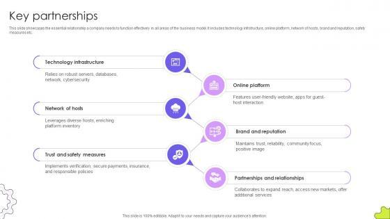 This slide showcases the essential relationship a company needs to function effectively in all areas of the business model. It includes technology infrstructure, online platform, network of hosts, brand and reputation, safety measures etc. Do you know about Slidesgeeks Key Partnerships Guest Accommodation Service Business Model BMC SS V These are perfect for delivering any kind od presentation. Using it, create PowerPoint presentations that communicate your ideas and engage audiences. Save time and effort by using our pre-designed presentation templates that are perfect for a wide range of topic. Our vast selection of designs covers a range of styles, from creative to business, and are all highly customizable and easy to edit. Download as a PowerPoint template or use them as Google Slides themes. This slide showcases the essential relationship a company needs to function effectively in all areas of the business model. It includes technology infrstructure, online platform, network of hosts, brand and reputation, safety measures etc.