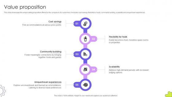 This slide showcases the unique selling proposition offered by the company to its customers. It includes cost savings, flexibility to hosts, community building, scalability and unique travel experiences. Do you have to make sure that everyone on your team knows about any specific topic I yes, then you should give Value Proposition Guest Accommodation Service Business Model BMC SS V a try. Our experts have put a lot of knowledge and effort into creating this impeccable Value Proposition Guest Accommodation Service Business Model BMC SS V. You can use this template for your upcoming presentations, as the slides are perfect to represent even the tiniest detail. You can download these templates from the Slidegeeks website and these are easy to edit. So grab these today This slide showcases the unique selling proposition offered by the company to its customers. It includes cost savings, flexibility to hosts, community building, scalability and unique travel experiences.