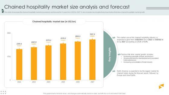 This slide showcases the chained hospitality market size analysis and forecast for 6 years from 2022 to 2027. It also includes key insights that shows factors that drive chained hospitality market growth. Create an editable Chained Hospitality Market Size Analysis And Forecast Lodging And Accommodation Industry IR SS V that communicates your idea and engages your audience. Whether you are presenting a business or an educational presentation, pre-designed presentation templates help save time. Chained Hospitality Market Size Analysis And Forecast Lodging And Accommodation Industry IR SS V is highly customizable and very easy to edit, covering many different styles from creative to business presentations. Slidegeeks has creative team members who have crafted amazing templates. So, go and get them without any delay. This slide showcases the chained hospitality market size analysis and forecast for 6 years from 2022 to 2027. It also includes key insights that shows factors that drive chained hospitality market growth.