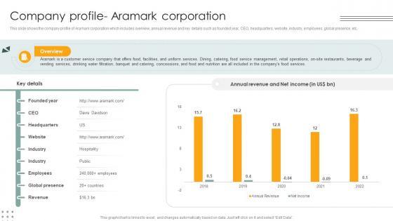 This slide shows the company profile of Aramark corporation which includes overview, annual revenue and key details such as founded year, CEO, headquarters, website, industry, employees, global presence, etc. Slidegeeks is one of the best resources for PowerPoint templates. You can download easily and regulate Company Profile Aramark Corporation Lodging And Accommodation Industry IR SS V for your personal presentations from our wonderful collection. A few clicks is all it takes to discover and get the most relevant and appropriate templates. Use our Templates to add a unique zing and appeal to your presentation and meetings. All the slides are easy to edit and you can use them even for advertisement purposes. This slide shows the company profile of Aramark corporation which includes overview, annual revenue and key details such as founded year, CEO, headquarters, website, industry, employees, global presence, etc.
