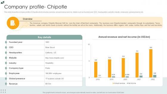 This slide shows the company profile of Chipotle which includes overview, annual revenue and key details such as founded year, CEO, headquarters, website, industry, employees, global presence, etc. Want to ace your presentation in front of a live audience Our Company Profile Chipotle Lodging And Accommodation Industry IR SS V can help you do that by engaging all the users towards you. Slidegeeks experts have put their efforts and expertise into creating these impeccable powerpoint presentations so that you can communicate your ideas clearly. Moreover, all the templates are customizable, and easy-to-edit and downloadable. Use these for both personal and commercial use. This slide shows the company profile of Chipotle which includes overview, annual revenue and key details such as founded year, CEO, headquarters, website, industry, employees, global presence, etc.