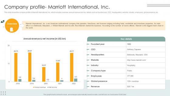 This slide shows the company profile of Marriott International, Inc. which includes overview, annual revenue and key details such as founded year, CEO, headquarters, website, industry, employees, global presence, etc. Do you have to make sure that everyone on your team knows about any specific topic I yes, then you should give Company Profile Marriott International Inc Lodging And Accommodation Industry IR SS V a try. Our experts have put a lot of knowledge and effort into creating this impeccable Company Profile Marriott International Inc Lodging And Accommodation Industry IR SS V. You can use this template for your upcoming presentations, as the slides are perfect to represent even the tiniest detail. You can download these templates from the Slidegeeks website and these are easy to edit. So grab these today This slide shows the company profile of Marriott International, Inc. which includes overview, annual revenue and key details such as founded year, CEO, headquarters, website, industry, employees, global presence, etc.