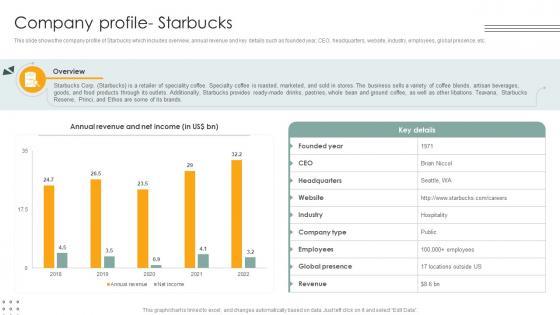 This slide shows the company profile of Starbucks which includes overview, annual revenue and key details such as founded year, CEO, headquarters, website, industry, employees, global presence, etc. Get a simple yet stunning designed Company Profile Starbucks Lodging And Accommodation Industry IR SS V. It is the best one to establish the tone in your meetings. It is an excellent way to make your presentations highly effective. So, download this PPT today from Slidegeeks and see the positive impacts. Our easy-to-edit Company Profile Starbucks Lodging And Accommodation Industry IR SS V can be your go-to option for all upcoming conferences and meetings. So, what are you waiting for Grab this template today. This slide shows the company profile of Starbucks which includes overview, annual revenue and key details such as founded year, CEO, headquarters, website, industry, employees, global presence, etc.