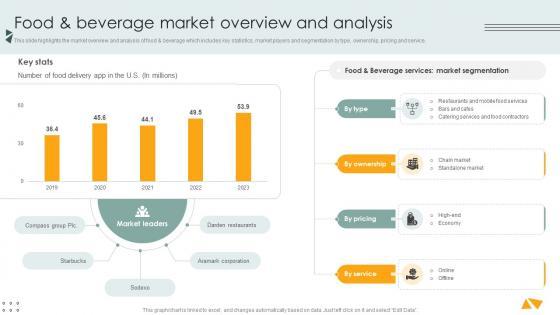 This slide showcases the executive summary of global hospitality industry report to provide comprehensive overview of entire report. It includes parameters such as industry overview, technological advancements, etc. Slidegeeks is here to make your presentations a breeze with Food And Beverage Market Overview And Analysis Lodging And Accommodation Industry IR SS V With our easy-to-use and customizable templates, you can focus on delivering your ideas rather than worrying about formatting. With a variety of designs to choose from, you are sure to find one that suits your needs. And with animations and unique photos, illustrations, and fonts, you can make your presentation pop. So whether you are giving a sales pitch or presenting to the board, make sure to check out Slidegeeks first This slide highlights the market overview and analysis of food and beverage which includes key statistics, market players and segmentation by type, ownership, pricing and service.