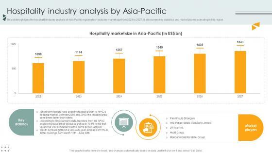 This slide highlights the hospitality industry analysis of Asia-Pacific region which includes market size from 2021 to 2027. It also covers key statistics and market players operating in this region. Find highly impressive Hospitality Industry Analysis By Asia Pacific Lodging And Accommodation Industry IR SS V on Slidegeeks to deliver a meaningful presentation. You can save an ample amount of time using these presentation templates. No need to worry to prepare everything from scratch because Slidegeeks experts have already done a huge research and work for you. You need to download Hospitality Industry Analysis By Asia Pacific Lodging And Accommodation Industry IR SS V for your upcoming presentation. All the presentation templates are 100 percent editable and you can change the color and personalize the content accordingly. Download now This slide highlights the hospitality industry analysis of Asia-Pacific region which includes market size from 2021 to 2027. It also covers key statistics and market players operating in this region.