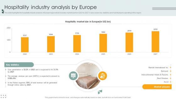 This slide highlights the hospitality industry analysis of Europe region which includes market size from 2021 to 2027. It also covers key statistics and market players operating in this region. If your project calls for a presentation, then Slidegeeks is your go-to partner because we have professionally designed, easy-to-edit templates that are perfect for any presentation. After downloading, you can easily edit Hospitality Industry Analysis By Europe Lodging And Accommodation Industry IR SS V and make the changes accordingly. You can rearrange slides or fill them with different images. Check out all the handy templates This slide highlights the hospitality industry analysis of Europe region which includes market size from 2021 to 2027. It also covers key statistics and market players operating in this region.
