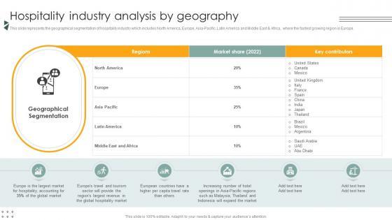 This slide represents the geographical segmentation of hospitality industry which includes North America, Europe, Asia-Pacific, Latin America and Middle East and Africa, where the fastest growing region is Europe. If you are looking for a format to display your unique thoughts, then the professionally designed Hospitality Industry Analysis By Geography Lodging And Accommodation Industry IR SS V is the one for you. You can use it as a Google Slides template or a PowerPoint template. Incorporate impressive visuals, symbols, images, and other charts. Modify or reorganize the text boxes as you desire. Experiment with shade schemes and font pairings. Alter, share or cooperate with other people on your work. Download Hospitality Industry Analysis By Geography Lodging And Accommodation Industry IR SS V and find out how to give a successful presentation. Present a perfect display to your team and make your presentation unforgettable. This slide represents the geographical segmentation of hospitality industry which includes North America, Europe, Asia-Pacific, Latin America and Middle East and Africa, where the fastest growing region is Europe.