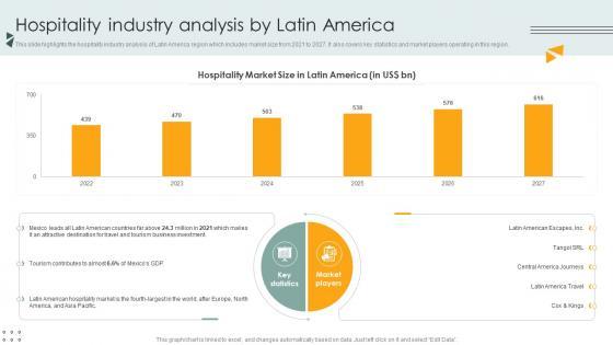 This slide highlights the hospitality industry analysis of Latin America region which includes market size from 2021 to 2027. It also covers key statistics and market players operating in this region. Are you in need of a template that can accommodate all of your creative concepts This one is crafted professionally and can be altered to fit any style. Use it with Google Slides or PowerPoint. Include striking photographs, symbols, depictions, and other visuals. Fill, move around, or remove text boxes as desired. Test out color palettes and font mixtures. Edit and save your work, or work with colleagues. Download Hospitality Industry Analysis By Latin America Lodging And Accommodation Industry IR SS V and observe how to make your presentation outstanding. Give an impeccable presentation to your group and make your presentation unforgettable. This slide highlights the hospitality industry analysis of Latin America region which includes market size from 2021 to 2027. It also covers key statistics and market players operating in this region.