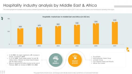 This slide highlights the hospitality industry analysis of Middle East and Africa region which includes market size from 2021 to 2027. It also covers key statistics and market players operating in this region. Crafting an eye-catching presentation has never been more straightforward. Let your presentation shine with this tasteful yet straightforward Hospitality Industry Analysis By Middle East And Africa Lodging And Accommodation Industry IR SS V template. It offers a minimalistic and classy look that is great for making a statement. The colors have been employed intelligently to add a bit of playfulness while still remaining professional. Construct the ideal Hospitality Industry Analysis By Middle East And Africa Lodging And Accommodation Industry IR SS V that effortlessly grabs the attention of your audience Begin now and be certain to wow your customers This slide highlights the hospitality industry analysis of Middle East and Africa region which includes market size from 2021 to 2027. It also covers key statistics and market players operating in this region.
