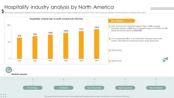 This slide showcases the hospitality industry analysis of North America region which includes market size from 2022 to 2027. It also covers key statistics and market players operating in this region. Make sure to capture your audiences attention in your business displays with our gratis customizable Hospitality Industry Analysis By North America Lodging And Accommodation Industry IR SS V. These are great for business strategies, office conferences, capital raising or task suggestions. If you desire to acquire more customers for your tech business and ensure they stay satisfied, create your own sales presentation with these plain slides. This slide showcases the hospitality industry analysis of North America region which includes market size from 2022 to 2027. It also covers key statistics and market players operating in this region.