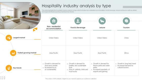 This slide highlights the hospitality industry analysis by type which includes non-residential accommodation, food and beverage, leisure and tourism with key details like largest and fastest growing market and key trends. Formulating a presentation can take up a lot of effort and time, so the content and message should always be the primary focus. The visuals of the PowerPoint can enhance the presenters message, so our Hospitality Industry Analysis By Type Lodging And Accommodation Industry IR SS V was created to help save time. Instead of worrying about the design, the presenter can concentrate on the message while our designers work on creating the ideal templates for whatever situation is needed. Slidegeeks has experts for everything from amazing designs to valuable content, we have put everything into Hospitality Industry Analysis By Type Lodging And Accommodation Industry IR SS V. This slide highlights the hospitality industry analysis by type which includes non-residential accommodation, food and beverage, leisure and tourism with key details like largest and fastest growing market and key trends.