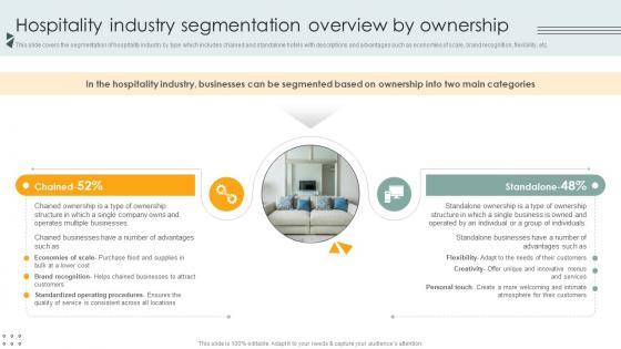 This slide covers the segmentation of hospitality industry by type which includes chained and standalone hotels with descriptions and advantages such as economies of scale, brand recognition, flexibility, etc. Coming up with a presentation necessitates that the majority of the effort goes into the content and the message you intend to convey. The visuals of a PowerPoint presentation can only be effective if it supplements and supports the story that is being told. Keeping this in mind our experts created Hospitality Industry Segmentation Overview By Ownership Lodging And Accommodation Industry IR SS V to reduce the time that goes into designing the presentation. This way, you can concentrate on the message while our designers take care of providing you with the right template for the situation. This slide covers the segmentation of hospitality industry by type which includes chained and standalone hotels with descriptions and advantages such as economies of scale, brand recognition, flexibility, etc.