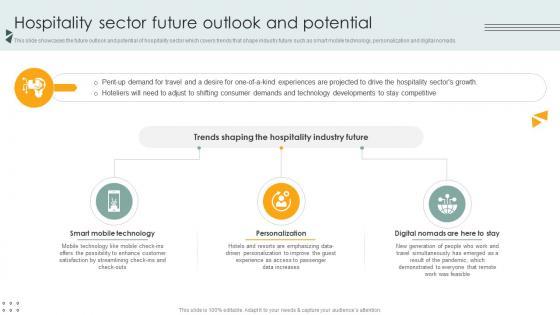 This slide showcases the future outlook and potential of hospitality sector which covers trends that shape industry future such as smart mobile technology, personalization and digital nomads. This Hospitality Sector Future Outlook And Potential Lodging And Accommodation Industry IR SS V is perfect for any presentation, be it in front of clients or colleagues. It is a versatile and stylish solution for organizing your meetings. The Hospitality Sector Future Outlook And Potential Lodging And Accommodation Industry IR SS V features a modern design for your presentation meetings. The adjustable and customizable slides provide unlimited possibilities for acing up your presentation. Slidegeeks has done all the homework before launching the product for you. So, do not wait, grab the presentation templates today This slide showcases the future outlook and potential of hospitality sector which covers trends that shape industry future such as smart mobile technology, personalization and digital nomads.
