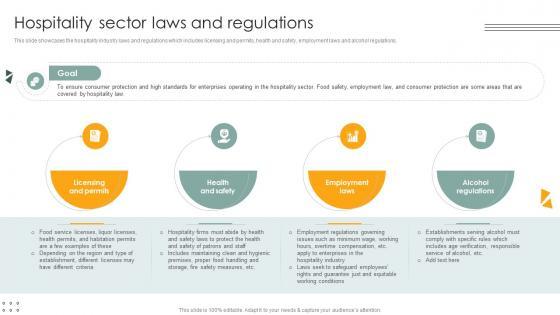 This slide showcases the hospitality industry laws and regulations which includes licensing and permits, health and safety, employment laws and alcohol regulations. Welcome to our selection of the Hospitality Sector Laws And Regulations Lodging And Accommodation Industry IR SS V. These are designed to help you showcase your creativity and bring your sphere to life. Planning and Innovation are essential for any business that is just starting out. This collection contains the designs that you need for your everyday presentations. All of our PowerPoints are 100Percent editable, so you can customize them to suit your needs. This multi-purpose template can be used in various situations. Grab these presentation templates today. This slide showcases the hospitality industry laws and regulations which includes licensing and permits, health and safety, employment laws and alcohol regulations.