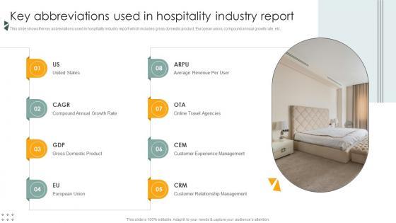 This slide shows the key abbreviations used in hospitality industry report which includes gross domestic product, European union, compound annual growth rate, etc. Are you searching for a Key Abbreviations Used In Hospitality Industry Report Lodging And Accommodation Industry IR SS V that is uncluttered, straightforward, and original Its easy to edit, and you can change the colors to suit your personal or business branding. For a presentation that expresses how much effort you have put in, this template is ideal With all of its features, including tables, diagrams, statistics, and lists, its perfect for a business plan presentation. Make your ideas more appealing with these professional slides. Download Key Abbreviations Used In Hospitality Industry Report Lodging And Accommodation Industry IR SS V from Slidegeeks today. This slide shows the key abbreviations used in hospitality industry report which includes gross domestic product, European union, compound annual growth rate, etc.