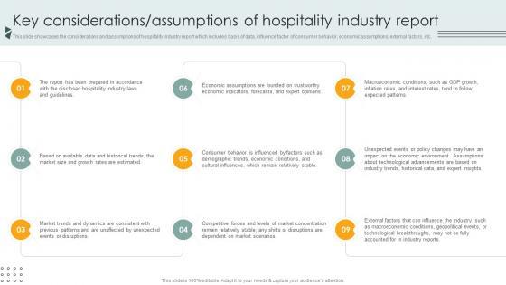 This slide showcases the considerations and assumptions of hospitality industry report which includes basis of data, influence factor of consumer behavior, economic assumptions, external factors, etc. Retrieve professionally designed Key Considerations Assumptions Of Hospitality Industry Lodging And Accommodation Industry IR SS V to effectively convey your message and captivate your listeners. Save time by selecting pre-made slideshows that are appropriate for various topics, from business to educational purposes. These themes come in many different styles, from creative to corporate, and all of them are easily adjustable and can be edited quickly. Access them as PowerPoint templates or as Google Slides themes. You do not have to go on a hunt for the perfect presentation because Slidegeeks got you covered from everywhere. This slide showcases the considerations and assumptions of hospitality industry report which includes basis of data, influence factor of consumer behavior, economic assumptions, external factors, etc.