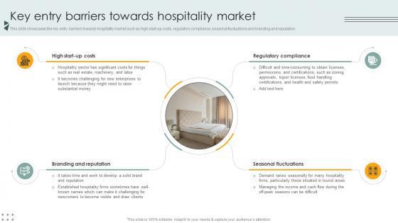 This slide showcases the key entry barriers towards hospitality market such as high start-up costs, regulatory compliance, seasonal fluctuations and branding and reputation. Slidegeeks has constructed Key Entry Barriers Towards Hospitality Market Lodging And Accommodation Industry IR SS V after conducting extensive research and examination. These presentation templates are constantly being generated and modified based on user preferences and critiques from editors. Here, you will find the most attractive templates for a range of purposes while taking into account ratings and remarks from users regarding the content. This is an excellent jumping-off point to explore our content and will give new users an insight into our top-notch PowerPoint Templates. This slide showcases the key entry barriers towards hospitality market such as high start-up costs, regulatory compliance, seasonal fluctuations and branding and reputation.