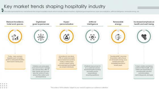 This slide represents the key market trends that shape hospitality industry which includes bleisure travellers, digitalized guest experiences, hyper-personalization, artificial intelligence, renewable energy, etc. Presenting this PowerPoint presentation, titled Key Market Trends Shaping Hospitality Industry Lodging And Accommodation Industry IR SS V, with topics curated by our researchers after extensive research. This editable presentation is available for immediate download and provides attractive features when used. Download now and captivate your audience. Presenting this Key Market Trends Shaping Hospitality Industry Lodging And Accommodation Industry IR SS V. Our researchers have carefully researched and created these slides with all aspects taken into consideration. This is a completely customizable Key Market Trends Shaping Hospitality Industry Lodging And Accommodation Industry IR SS V that is available for immediate downloading. Download now and make an impact on your audience. Highlight the attractive features available with our PPTs. This slide represents the key market trends that shape hospitality industry which includes bleisure travellers, digitalized guest experiences, hyper-personalization, artificial intelligence, renewable energy, etc.