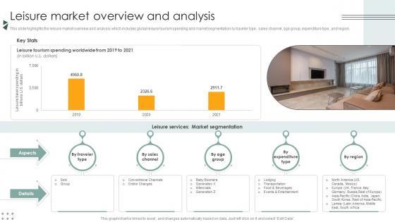 This slide highlights the leisure market overview and analysis which includes global leisure tourism spending and market segmentation by traveler type, sales channel, age group, expenditure type, and region. Here you can discover an assortment of the finest PowerPoint and Google Slides templates. With these templates, you can create presentations for a variety of purposes while simultaneously providing your audience with an eye-catching visual experience. Download Leisure Market Overview And Analysis Lodging And Accommodation Industry IR SS V to deliver an impeccable presentation. These templates will make your job of preparing presentations much quicker, yet still, maintain a high level of quality. Slidegeeks has experienced researchers who prepare these templates and write high-quality content for you. Later on, you can personalize the content by editing the Leisure Market Overview And Analysis Lodging And Accommodation Industry IR SS V. This slide highlights the leisure market overview and analysis which includes global leisure tourism spending and market segmentation by traveler type, sales channel, age group, expenditure type, and region.