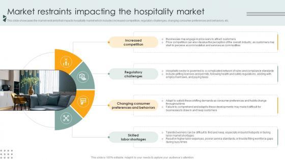 This slide showcases the market restraints that impacts hospitality market which includes increased competition, regulatory challenges, changing consumer preferences and behaviors, etc. This Market Restraints Impacting The Hospitality Market Lodging And Accommodation Industry IR SS V from Slidegeeks makes it easy to present information on your topic with precision. It provides customization options, so you can make changes to the colors, design, graphics, or any other component to create a unique layout. It is also available for immediate download, so you can begin using it right away. Slidegeeks has done good research to ensure that you have everything you need to make your presentation stand out. Make a name out there for a brilliant performance. This slide showcases the market restraints that impacts hospitality market which includes increased competition, regulatory challenges, changing consumer preferences and behaviors, etc.