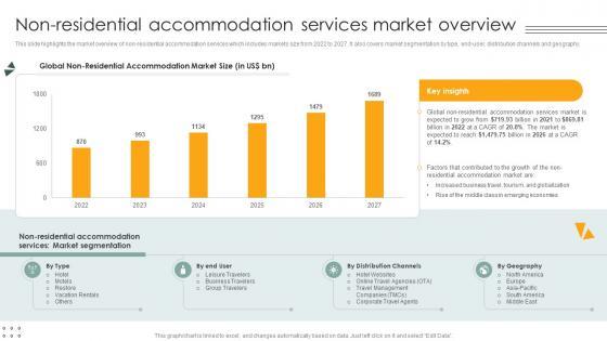 This slide highlights the market overview of non-residential accommodation services which includes markets size from 2022 to 2027. It also covers market segmentation by type, end-user, distribution channels and geography. Take your projects to the next level with our ultimate collection of Non Residential Accommodation Services Market Overview Lodging And Accommodation Industry IR SS V. Slidegeeks has designed a range of layouts that are perfect for representing task or activity duration, keeping track of all your deadlines at a glance. Tailor these designs to your exact needs and give them a truly corporate look with your own brand colors they will make your projects stand out from the rest This slide highlights the market overview of non-residential accommodation services which includes markets size from 2022 to 2027. It also covers market segmentation by type, end-user, distribution channels and geography.