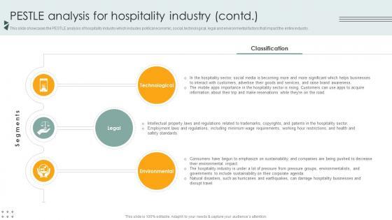 This slide showcases the PESTLE analysis of hospitality industry which includes political economic, social, technological, legal and environmental factors that impact the entire industry. Do you know about Slidesgeeks Pestle Analysis For Hospitality Industry Lodging And Accommodation Industry IR SS V These are perfect for delivering any kind od presentation. Using it, create PowerPoint presentations that communicate your ideas and engage audiences. Save time and effort by using our pre-designed presentation templates that are perfect for a wide range of topic. Our vast selection of designs covers a range of styles, from creative to business, and are all highly customizable and easy to edit. Download as a PowerPoint template or use them as Google Slides themes. This slide showcases the PESTLE analysis of hospitality industry which includes political economic, social, technological, legal and environmental factors that impact the entire industry.