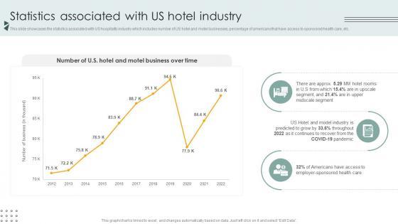 This slide showcases the statistics associated with US hospitality industry which includes number of US hotel and motel businesses, percentage of americans that have access to sponsored health care, etc. Want to ace your presentation in front of a live audience Our Statistics Associated With Us Hotel Industry Lodging And Accommodation Industry IR SS V can help you do that by engaging all the users towards you. Slidegeeks experts have put their efforts and expertise into creating these impeccable powerpoint presentations so that you can communicate your ideas clearly. Moreover, all the templates are customizable, and easy-to-edit and downloadable. Use these for both personal and commercial use. This slide showcases the statistics associated with US hospitality industry which includes number of US hotel and motel businesses, percentage of americans that have access to sponsored health care, etc.