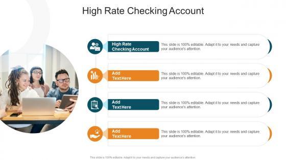 Introducing our well-designed High Rate Checking Account In Powerpoint And Google Slides Cpb. This PowerPoint design presents information on topics like High Rate Checking Account. As it is predesigned it helps boost your confidence level. It also makes you a better presenter because of its high-quality content and graphics. This PPT layout can be downloaded and used in different formats like PDF, PNG, and JPG. Not only this, it is available in both Standard Screen and Widescreen aspect ratios for your convenience. Therefore, click on the download button now to persuade and impress your audience. Our High Rate Checking Account In Powerpoint And Google Slides Cpb are topically designed to provide an attractive backdrop to any subject. Use them to look like a presentation pro.