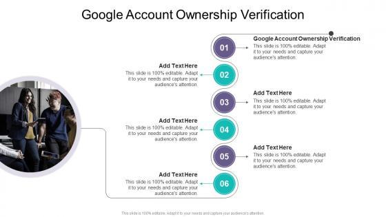 Presenting our innovatively-designed set of slides titled Google Account Ownership Verification In Powerpoint And Google Slides Cpb. This completely editable PowerPoint graphic exhibits Google Account Ownership Verification that will help you convey the message impactfully. It can be accessed with Google Slides and is available in both standard screen and widescreen aspect ratios. Apart from this, you can download this well-structured PowerPoint template design in different formats like PDF, JPG, and PNG. So, click the download button now to gain full access to this PPT design. Our Google Account Ownership Verification In Powerpoint And Google Slides Cpb are topically designed to provide an attractive backdrop to any subject. Use them to look like a presentation pro.