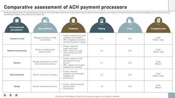 Mentioned slide illustrates comparative analysis of various ACH Automated Clearing House payment processors which can be leveraged by businesses to making bank transfer. It includes key attributes such as ACH processors, best attribute, features, rating, price, and company size. Are you searching for a Online Payment Techniques Comparative Assessment Of Ach Payment Processors that is uncluttered, straightforward, and original Its easy to edit, and you can change the colors to suit your personal or business branding. For a presentation that expresses how much effort you have put in, this template is ideal With all of its features, including tables, diagrams, statistics, and lists, its perfect for a business plan presentation. Make your ideas more appealing with these professional slides. Download Online Payment Techniques Comparative Assessment Of Ach Payment Processors from Slidegeeks today. Mentioned slide illustrates comparative analysis of various ACH Automated Clearing House payment processors which can be leveraged by businesses to making bank transfer. It includes key attributes such as ACH processors, best attribute, features, rating, price, and company size.
