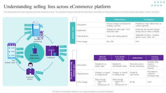 This slide provides information regarding selling fees charged by Amazon. The selling fees charges is bifurcated into referral fees, closing fees, domestic processing, cross-border processing, authorization, currency conversion. If your project calls for a presentation, then Slidegeeks is your go-to partner because we have professionally designed, easy-to-edit templates that are perfect for any presentation. After downloading, you can easily edit Understanding Selling Fees Across Ecommerce Platform Pictures PDF and make the changes accordingly. You can rearrange slides or fill them with different images. Check out all the handy templates
