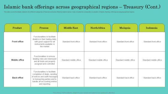 This slide covers the details related to the different categories of financial contracts offered by Islamic banks. It also includes the comparative evaluation of Islamic Banking offerings across geographical regions. This Islamic Bank Offerings Across Geographical Comprehensive Guide To Islamic Structure Pdf from Slidegeeks makes it easy to present information on your topic with precision. It provides customization options, so you can make changes to the colors, design, graphics, or any other component to create a unique layout. It is also available for immediate download, so you can begin using it right away. Slidegeeks has done good research to ensure that you have everything you need to make your presentation stand out. Make a name out there for a brilliant performance. This slide covers the details related to the different categories of financial contracts offered by Islamic banks. It also includes the comparative evaluation of Islamic Banking offerings across geographical regions.
