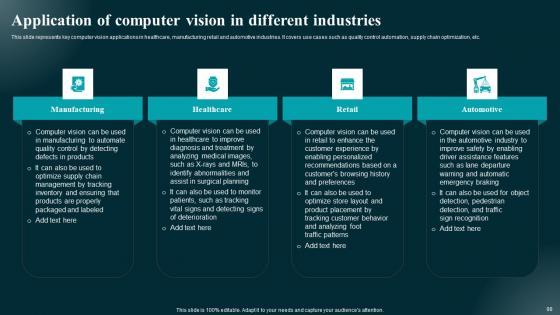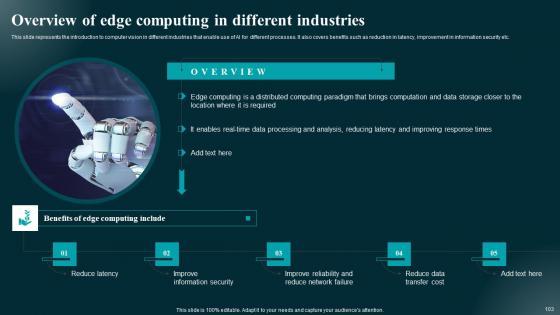 This slide exhibits application of edge computing across multiple industries aimed at enhancing operational efficiency in case of lost data connection. It includes various industries such as automobile, manufacturing, healthcare, and agriculture. Crafting an eye-catching presentation has never been more straightforward. Let your presentation shine with this tasteful yet straightforward Building Trust With IoT Security Edge Computing Use Cases AcroSS Various Industries IoT SS V template. It offers a minimalistic and classy look that is great for making a statement. The colors have been employed intelligently to add a bit of playfulness while still remaining professional. Construct the ideal Building Trust With IoT Security Edge Computing Use Cases AcroSS Various Industries IoT SS V that effortlessly grabs the attention of your audience Begin now and be certain to wow your customers This slide exhibits application of edge computing across multiple industries aimed at enhancing operational efficiency in case of lost data connection. It includes various industries such as automobile, manufacturing, healthcare, and agriculture.