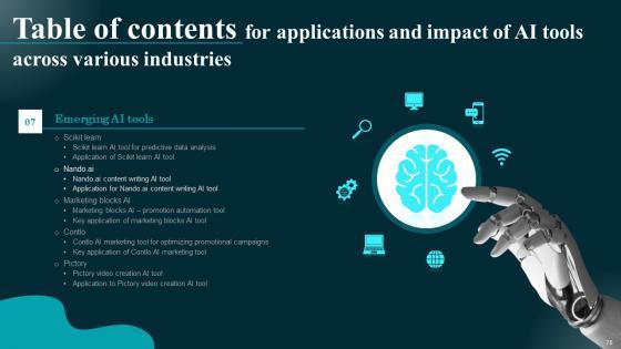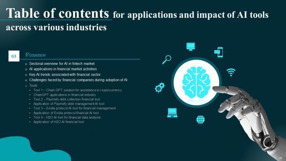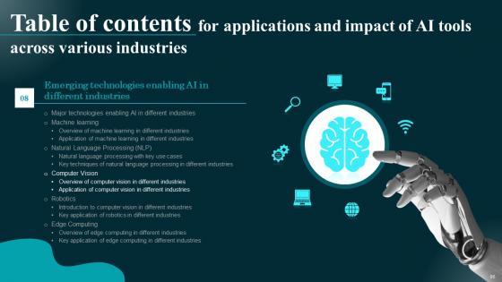 This Applications And Impact Of AI Tools Across Various Industries Table Of Contents Brochure Pdf is perfect for any presentation, be it in front of clients or colleagues. It is a versatile and stylish solution for organizing your meetings. The Applications And Impact Of AI Tools Across Various Industries Table Of Contents Brochure Pdf features a modern design for your presentation meetings. The adjustable and customizable slides provide unlimited possibilities for acing up your presentation. Slidegeeks has done all the homework before launching the product for you. So, do not wait, grab the presentation templates today Our Applications And Impact Of AI Tools Across Various Industries Table Of Contents Brochure Pdf are topically designed to provide an attractive backdrop to any subject. Use them to look like a presentation pro.