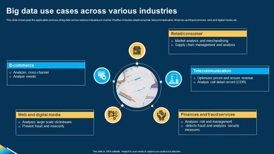This slide showcases the application and use of big data across various industries in market. It further includes retail, consumer, telecommunication, finances and fraud services, web and digital media, etc. Pitch your topic with ease and precision using this Big Data Use Cases Across Various Industries Ppt Icon Deck pdf. This layout presents information on Consumer, Telecommunication, Finances. It is also available for immediate download and adjustment. So, changes can be made in the color, design, graphics or any other component to create a unique layout. This slide showcases the application and use of big data across various industries in market. It further includes retail, consumer, telecommunication, finances and fraud services, web and digital media, etc.