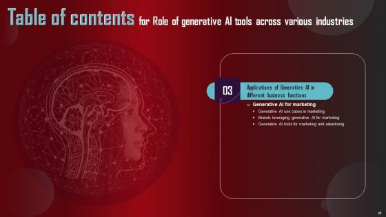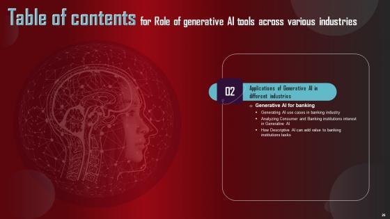 Slidegeeks is here to make your presentations a breeze with Table Of Contents For Role Of Generative AI Tools Across Various Industries Infographics Pdf With our easy to use and customizable templates, you can focus on delivering your ideas rather than worrying about formatting. With a variety of designs to choose from, you are sure to find one that suits your needs. And with animations and unique photos, illustrations, and fonts, you can make your presentation pop. So whether you are giving a sales pitch or presenting to the board, make sure to check out Slidegeeks first. Our Table Of Contents For Role Of Generative AI Tools Across Various Industries Infographics Pdf are topically designed to provide an attractive backdrop to any subject. Use them to look like a presentation pro.
