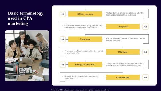 Create an editable Basic Terminology Used In CPA Marketing Executing Cost Per Action Marketing Sample Pdf that communicates your idea and engages your audience. Whether you are presenting a business or an educational presentation, pre-designed presentation templates help save time. Basic Terminology Used In CPA Marketing Executing Cost Per Action Marketing Sample Pdf is highly customizable and very easy to edit, covering many different styles from creative to business presentations. Slidegeeks has creative team members who have crafted amazing templates. So, go and get them without any delay. Our Basic Terminology Used In CPA Marketing Executing Cost Per Action Marketing Sample Pdf are topically designed to provide an attractive backdrop to any subject. Use them to look like a presentation pro.
