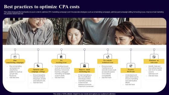 This slide showcase the best tactics to use in order to optimize CPA marketing campaign cost. It incorporate strategies such as remarketing campaigns, optimize paid campaign setting, fix tracking issue, improve email marketing list, practice 8020 rules etc. Slidegeeks is one of the best resources for PowerPoint templates. You can download easily and regulate Best Practices To Optimize CPA Costs Executing Cost Per Action Marketing Template Pdf for your personal presentations from our wonderful collection. A few clicks is all it takes to discover and get the most relevant and appropriate templates. Use our Templates to add a unique zing and appeal to your presentation and meetings. All the slides are easy to edit and you can use them even for advertisement purposes. This slide showcase the best tactics to use in order to optimize CPA marketing campaign cost. It incorporate strategies such as remarketing campaigns, optimize paid campaign setting, fix tracking issue, improve email marketing list, practice 8020 rules etc.