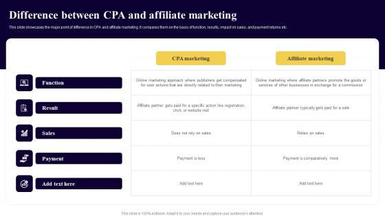 This slide showcases the major point of difference in CPA and affiliate marketing. It compares them on the basis of function, results, impact on sales, and payment returns etc. Do you have an important presentation coming up Are you looking for something that will make your presentation stand out from the rest Look no further than Difference Between CPA And Affiliate Marketing Executing Cost Per Action Marketing Ideas Pdf. With our professional designs, you can trust that your presentation will pop and make delivering it a smooth process. And with Slidegeeks, you can trust that your presentation will be unique and memorable. So why wait Grab Difference Between CPA And Affiliate Marketing Executing Cost Per Action Marketing Ideas Pdf today and make your presentation stand out from the rest. This slide showcases the major point of difference in CPA and affiliate marketing. It compares them on the basis of function, results, impact on sales, and payment returns etc.