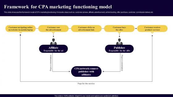 This slide showcase the framework model of CPA marketing functioning. It includes steps such as, customer ad view, affiliate advertisement, ad link tracking, offer purchase, customer, commission delivery etc. Find highly impressive Framework For CPA Marketing Functioning Model Executing Cost Per Action Marketing Graphics Pdf on Slidegeeks to deliver a meaningful presentation. You can save an ample amount of time using these presentation templates. No need to worry to prepare everything from scratch because Slidegeeks experts have already done a huge research and work for you. You need to download Framework For CPA Marketing Functioning Model Executing Cost Per Action Marketing Graphics Pdf for your upcoming presentation. All the presentation templates are 100 percent editable and you can change the color and personalize the content accordingly. Download now. This slide showcase the framework model of CPA marketing functioning. It includes steps such as, customer ad view, affiliate advertisement, ad link tracking, offer purchase, customer, commission delivery etc.