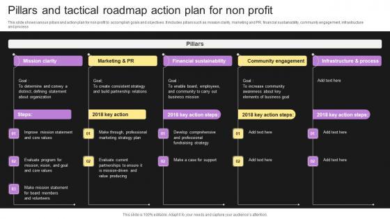 This slide shows various pillars and action plan for non profit to accomplish goals and objectives. It includes pillars such as mission clarity, marketing and PR, financial sustainability, community engagement, infrastructure and process.Showcasing this set of slides titled Pillars And Tactical Roadmap Action Plan For Non Profit Professional Pdf The topics addressed in these templates are Financial Sustainability, Community Engagement, Infrastructure Process All the content presented in this PPT design is completely editable. Download it and make adjustments in color, background, font etc. as per your unique business setting. This slide shows various pillars and action plan for non profit to accomplish goals and objectives. It includes pillars such as mission clarity, marketing and PR, financial sustainability, community engagement, infrastructure and process.