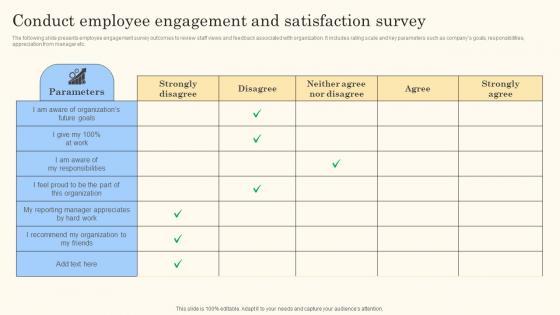 The following slide presents employee engagement survey outcomes to review staff views and feedback associated with organization. It includes rating scale and key parameters such as companys goals, responsibilities, appreciation from manager etc.The best PPT templates are a great way to save time, energy, and resources. Slidegeeks have 100Precent editable powerpoint slides making them incredibly versatile. With these quality presentation templates, you can create a captivating and memorable presentation by combining visually appealing slides and effectively communicating your message. Download Conduct Employee Engagement And Action Steps For Employee Engagement Topics Pdf from Slidegeeks and deliver a wonderful presentation. The following slide presents employee engagement survey outcomes to review staff views and feedback associated with organization. It includes rating scale and key parameters such as companys goals, responsibilities, appreciation from manager etc.