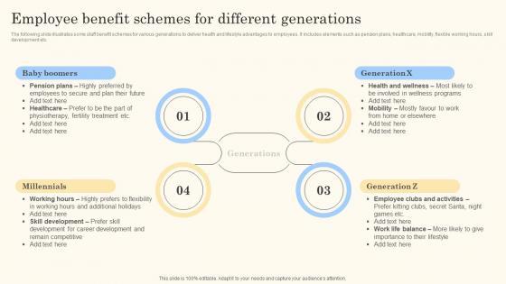 The following slide illustrates some staff benefit schemes for various generations to deliver health and lifestyle advantages to employees. It includes elements such as pension plans, healthcare, mobility, flexible working hours, skill development etc.Presenting this PowerPoint presentation, titled Employee Benefit Schemes For Different Action Steps For Employee Engagement Professional Pdf, with topics curated by our researchers after extensive research. This editable presentation is available for immediate download and provides attractive features when used. Download now and captivate your audience. Presenting this Employee Benefit Schemes For Different Action Steps For Employee Engagement Professional Pdf. Our researchers have carefully researched and created these slides with all aspects taken into consideration. This is a completely customizable Employee Benefit Schemes For Different Action Steps For Employee Engagement Professional Pdf that is available for immediate downloading. Download now and make an impact on your audience. Highlight the attractive features available with our PPTs. The following slide illustrates some staff benefit schemes for various generations to deliver health and lifestyle advantages to employees. It includes elements such as pension plans, healthcare, mobility, flexible working hours, skill development etc.