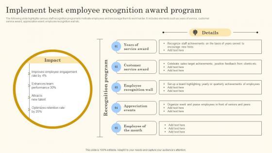 The following slide highlights various staff recognition programs to motivate employees and encourage them to work harder. It includes elements such as years of service, customer service award, appreciation event, employee recognition wall etc.Want to ace your presentation in front of a live audience Our Implement Best Employee Recognition Action Steps For Employee Engagement Slides Pdf can help you do that by engaging all the users towards you.. Slidegeeks experts have put their efforts and expertise into creating these impeccable powerpoint presentations so that you can communicate your ideas clearly. Moreover, all the templates are customizable, and easy-to-edit and downloadable. Use these for both personal and commercial use. The following slide highlights various staff recognition programs to motivate employees and encourage them to work harder. It includes elements such as years of service, customer service award, appreciation event, employee recognition wall etc.