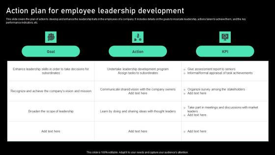 This slide covers the plan of action to develop and enhance the leadership traits in the employees of a company. It includes details on the goals to inculcate leadership,actions taken to achieve them,and the key performance indicators,etc. Showcasing this set of slides titled Action Plan For Employee Leadership Development Mockup Pdf. The topics addressed in these templates are Actions Taken,Key Performance Indicators,Business. All the content presented in this PPT design is completely editable. Download it and make adjustments in color,background,font etc. as per your unique business setting. This slide covers the plan of action to develop and enhance the leadership traits in the employees of a company. It includes details on the goals to inculcate leadership, actions taken to achieve them, and the key performance indicators, etc.