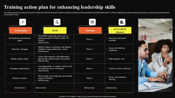 This slide presents coaching action plan for leadership skills development, helpful in guiding employees professionally through authoritative path. It includes setting goals, determining training needs, recognizing opportunities and measuring success. Pitch your topic with ease and precision using this Training Action Plan For Enhancing Leadership Skills Rules Pdf. This layout presents information on Determine Skill Gaps, Recognize Opportunities. It is also available for immediate download and adjustment. So, changes can be made in the color, design, graphics or any other component to create a unique layout. This slide presents coaching action plan for leadership skills development, helpful in guiding employees professionally through authoritative path. It includes setting goals, determining training needs, recognizing opportunities and measuring success.