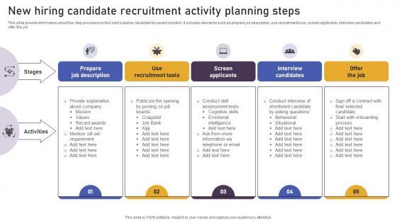 This slide provide information about five step procedure to find best suitable candidate for vacant position. It includes elements such as prepare job description, use recruitment tools, screen applicants, interview candidates and offer the job. Showcasing this set of slides titled New Hiring Candidate Recruitment Activity Planning Steps Guidelines Pdf. The topics addressed in these templates are Prepare Job Description, Use Recruitment Tools. All the content presented in this PPT design is completely editable. Download it and make adjustments in color, background, font etc. as per your unique business setting. This slide provide information about five step procedure to find best suitable candidate for vacant position. It includes elements such as prepare job description, use recruitment tools, screen applicants, interview candidates and offer the job.