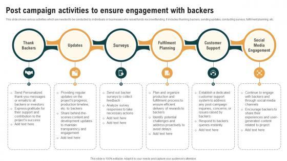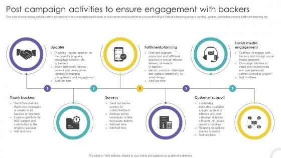 This slide shows various activities which are needed to be conducted by individuals or businesses who raised funds via crowdfunding. It includes thanking backers, sending updates, conducting surveys, fulfilment planning, etc. Here you can discover an assortment of the finest PowerPoint and Google Slides templates. With these templates, you can create presentations for a variety of purposes while simultaneously providing your audience with an eye-catching visual experience. Download Post Campaign Activities To Ensure Engagement Crowdfunding Strategies To Raise Funds Fin SS V to deliver an impeccable presentation. These templates will make your job of preparing presentations much quicker, yet still, maintain a high level of quality. Slidegeeks has experienced researchers who prepare these templates and write high-quality content for you. Later on, you can personalize the content by editing the Post Campaign Activities To Ensure Engagement Crowdfunding Strategies To Raise Funds Fin SS V. This slide shows various activities which are needed to be conducted by individuals or businesses who raised funds via crowdfunding. It includes thanking backers, sending updates, conducting surveys, fulfilment planning, etc.
