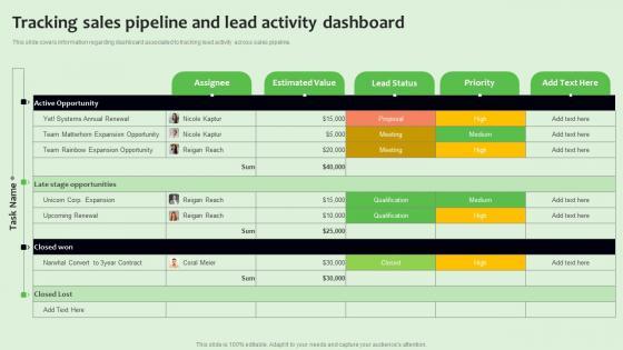 This slide covers information regarding dashboard associated to tracking lead activity across sales pipeline. Explore a selection of the finest Tracking Sales Pipeline And Lead Activity Dashboard Managing Sales Pipeline Health Professional PDF here. With a plethora of professionally designed and pre-made slide templates, you can quickly and easily find the right one for your upcoming presentation. You can use our Tracking Sales Pipeline And Lead Activity Dashboard Managing Sales Pipeline Health Professional PDF to effectively convey your message to a wider audience. Slidegeeks has done a lot of research before preparing these presentation templates. The content can be personalized and the slides are highly editable. Grab templates today from Slidegeeks.