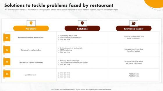 This slide showcases marketing solutions that can help organization to tackle issues faced by restaurant. Its key elements are problems, solutions and estimated impact. Boost your pitch with our creative Online Promotional Activities Solutions To Tackle Problems Faced By Clipart Pdf. Deliver an awe inspiring pitch that will mesmerize everyone. Using these presentation templates you will surely catch everyones attention. You can browse the ppts collection on our website. We have researchers who are experts at creating the right content for the templates. So you do not have to invest time in any additional work. Just grab the template now and use them. This slide showcases marketing solutions that can help organization to tackle issues faced by restaurant. Its key elements are problems, solutions and estimated impact.